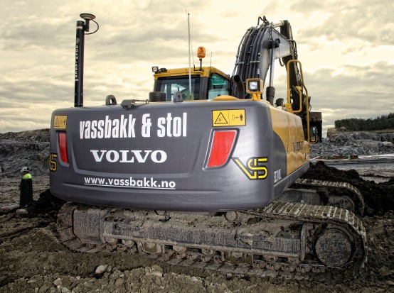 Dette er den første gravemaskinen i Vassbakk & Stol, som er montert med ExaDriller maskinstyring og dus sensorer for å måle ut skyv på boretårnet.