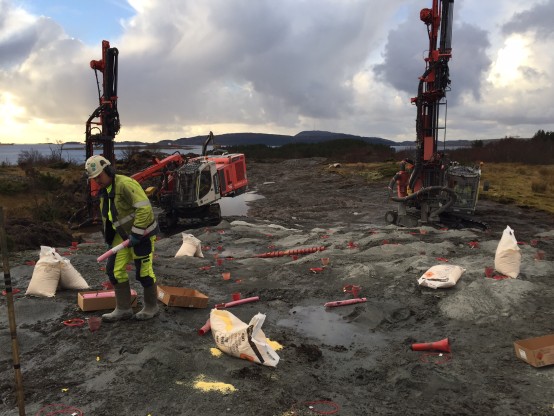 Vi skal totalt sprenge ca. 45.000m³, etablere anleggsvei langs kabel traséen og planere for tomt, riggplass og pumpestasjon på Haugsneset.
